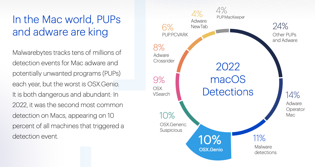 While Macs are less bombarded with malware than Windows, they’re not immune. Across 2022, Malwarebytes says the most common detection on macOS was adware.