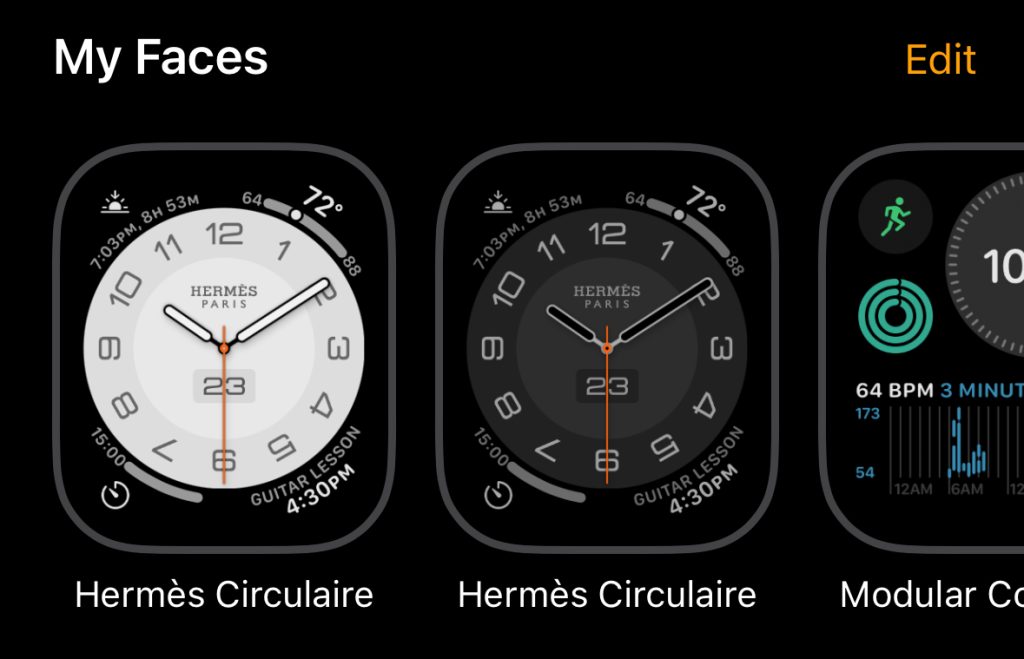 Color aside, there are many watch faces that have versions with white analog clocks or dark gray and black analog clocks. I prefer an analog watch face to a digital clock. White analog clocks are more legible and detailed to my eyes, especially in sunlight, but I can’t commit to using them for long.