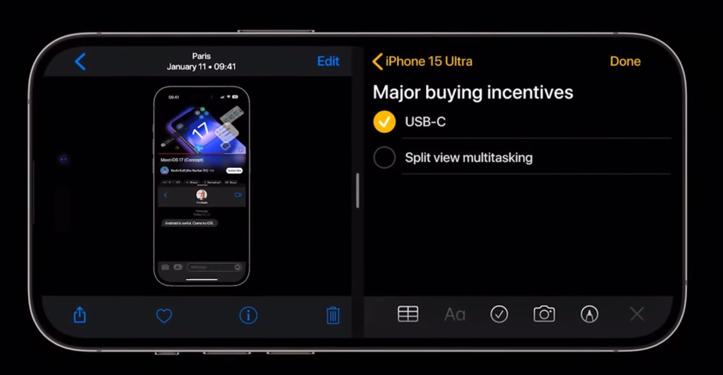 With iPhone displays getting larger and larger, we are now at a point where we could fit two apps into one screen. It would work with both landscape and portrait orientations. There is enough RAM, CPU, and screen real estate to get this done. I would love to be able to scroll through Twitter while watching something on YouTube (without PiP) or maybe have a PDF open and my notes app open to copy some text over or even have maps open alongside a second app. There are multiple use cases that make sense, so having a split view would be a great addition to iOS 17.
