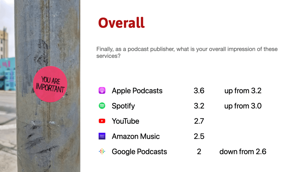 The final “overall” category, which asks podcast publishers their “overall impression” of these services, shows the success of Apple this year (scores out of 5):
