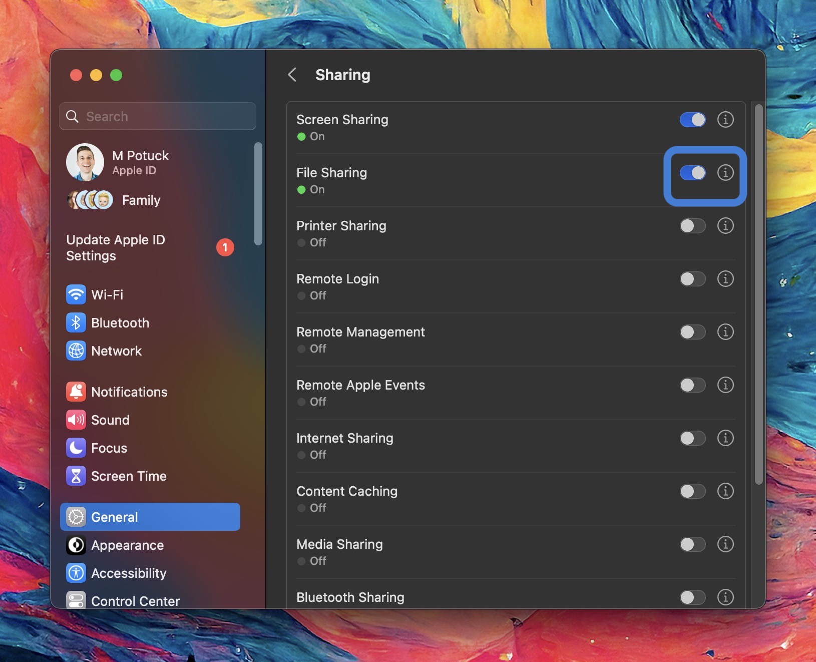 - Now choose Sharing and turn on File Sharing – the second option from the top
