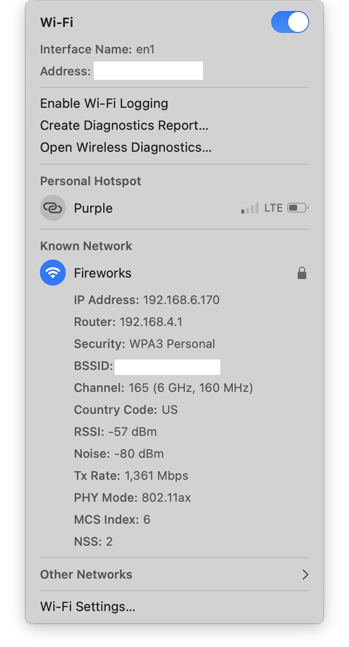 To see if your Mac mini is connected to the 6 GHz band, simply hold the Option key while clicking the Wi-Fi icon in the macOS menu bar. Doing so reveals advanced Wi-Fi connectivity details, including the channel, frequency band, Tx rate, and more.