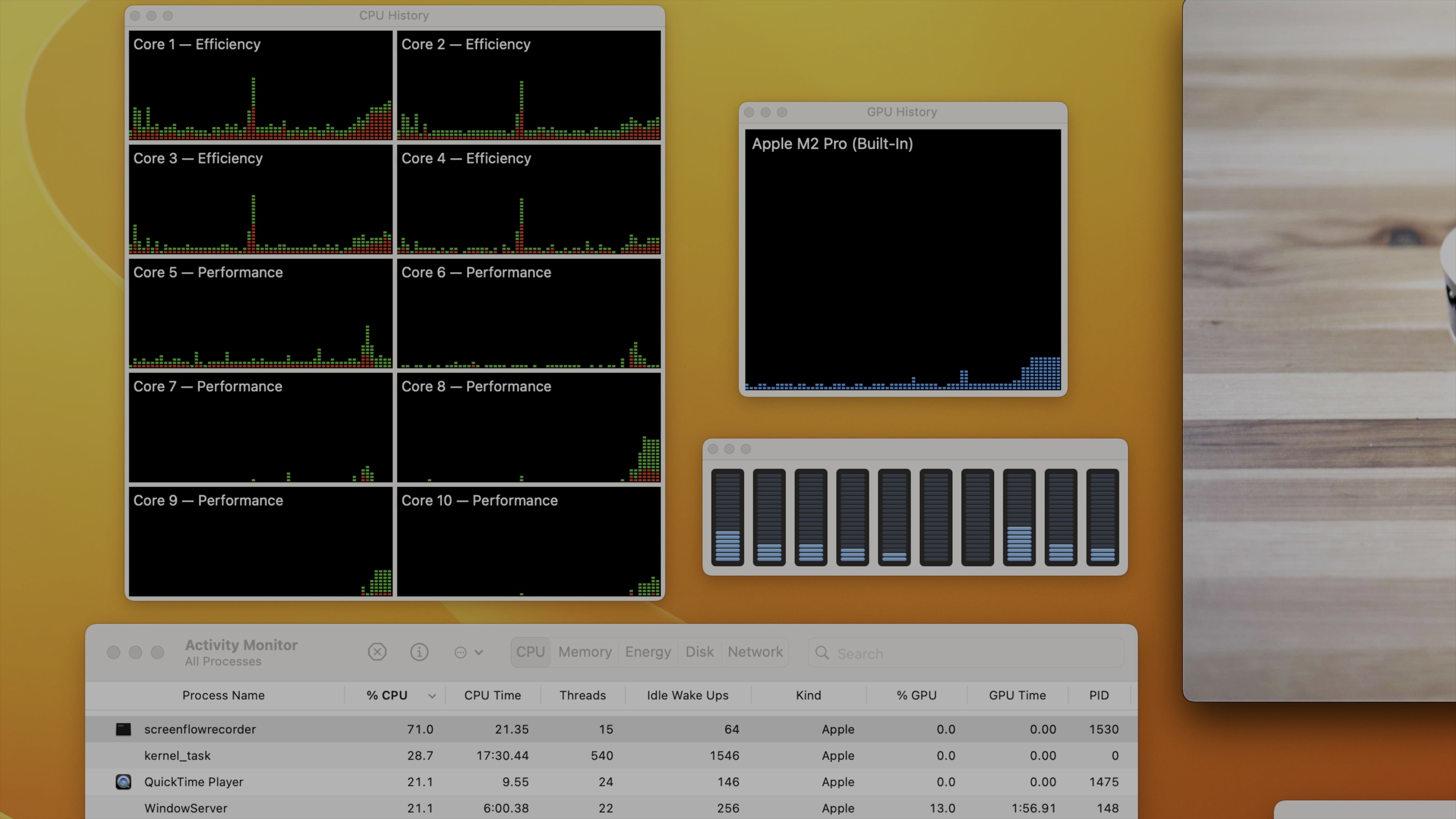 On the M2 and M2 Pro, I can playback ProRes video, and you’ll notice that the CPU stays relatively quiet. Instead of it doing the heavy lifting, the dedicated ProRes accelerators do the job instead. This allows the CPU to handle other functionality, such as rending Finder windows, multitasking, etc. The result is a much smoother and usable experience when working with 8K ProRes.