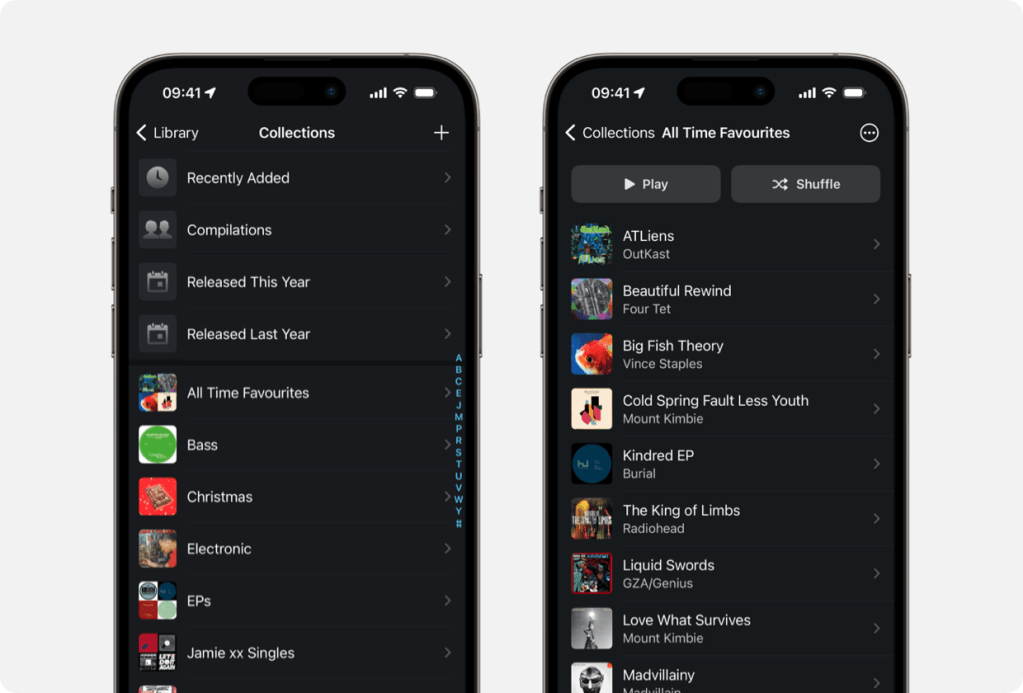 Group albums together into custom lists with Album Collections. Create a Collection for your favourite albums this year, keep a list of albums in your library you want to tell someone about, or organise albums together by mood or season. Collections are customisable and flexible, so use them however you want.