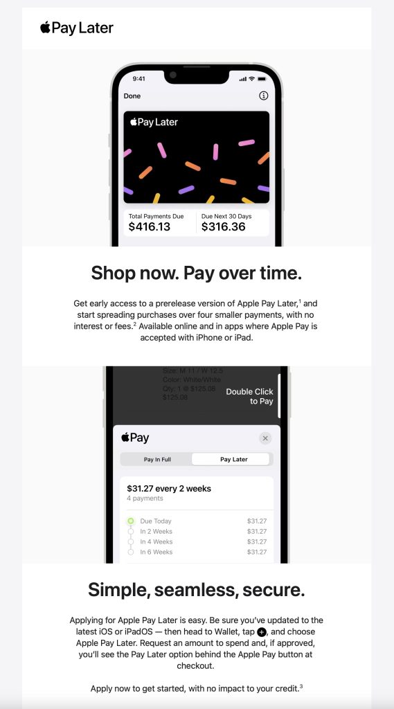 If you receive this “early access” email from Apple, you can head to the Wallet app on your iPhone to start the application process. Apple Pay Later allows customers in the United States to split purchases into four equal payments across six weeks, with no fees or interest. The feature is available anywhere Apple Pay is accepted online or in-app.