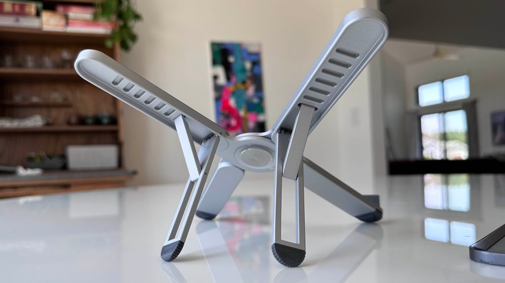 I love the spring-loaded rear legs and there are seven different height positions. The whole surface where your iPad or MacBook rests has a silicone pad, and it all folds up neatly into an included carry bag to make it easy to take on the go.