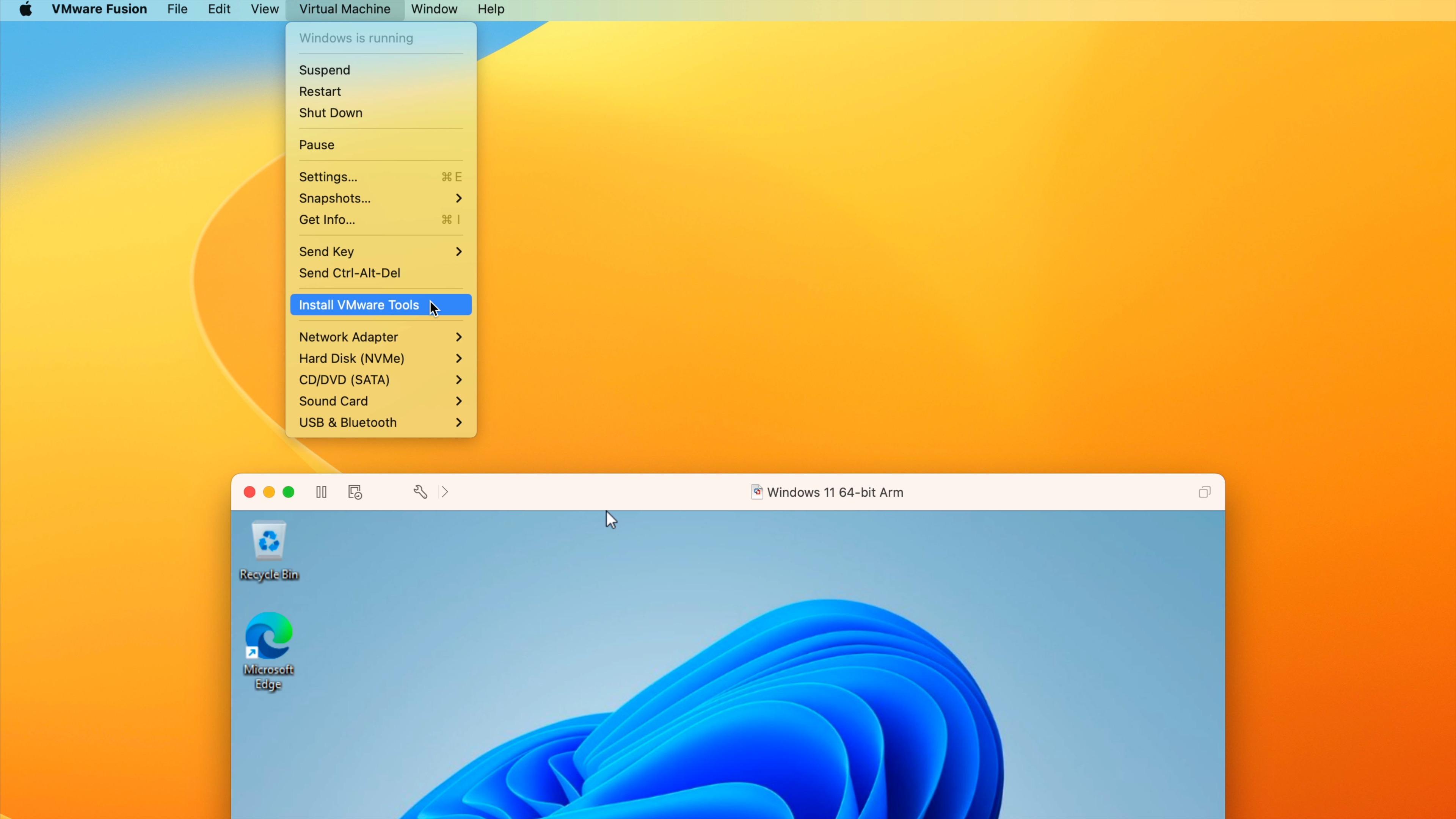 Step 9: In the Mac menu bar click Virtual Machine → Install VMware Tools. Click the Install button on the pop-up that appears to mount the virtual DVD-ROM drive.