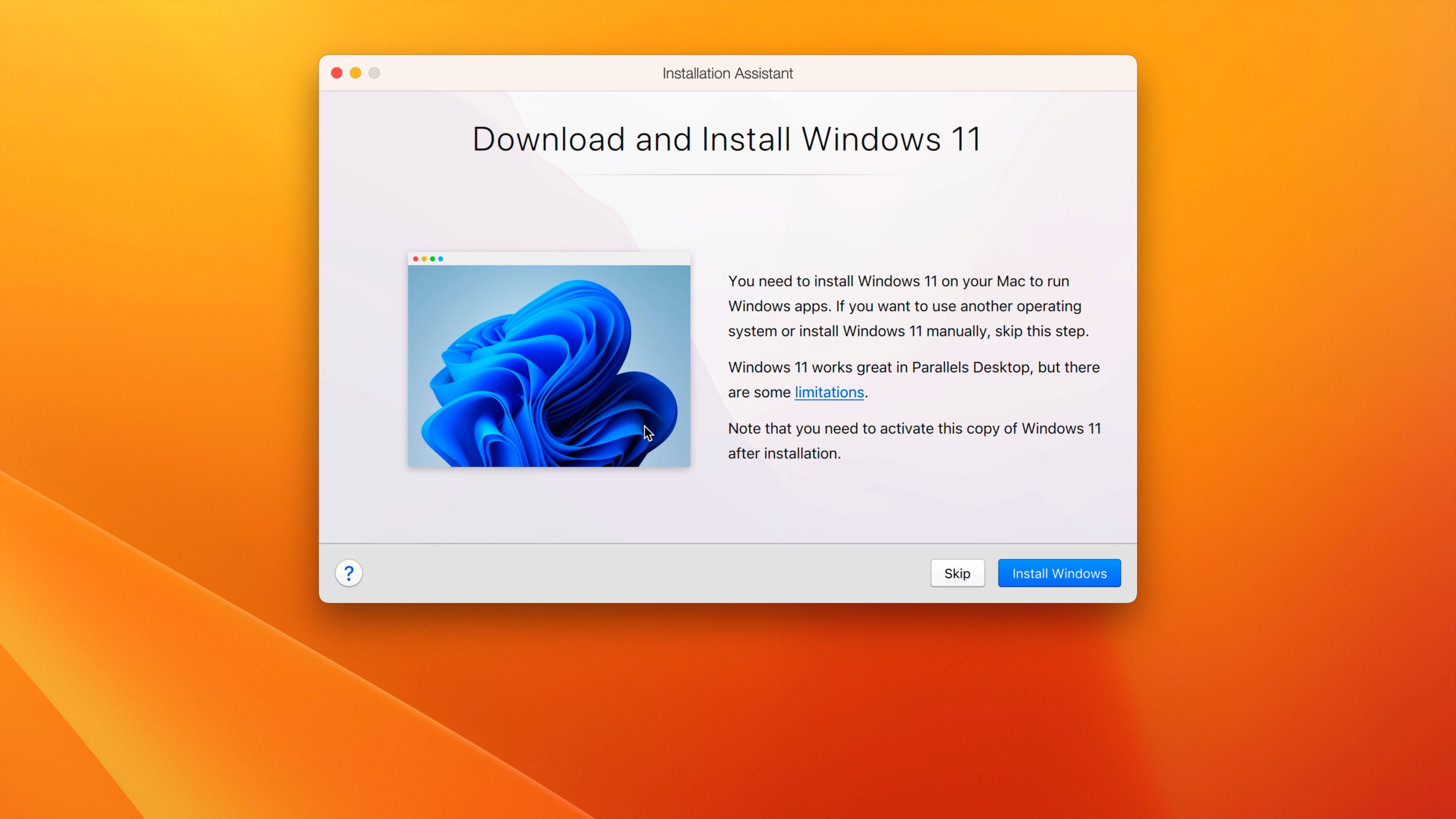 Step 5: After a brief initialization process, Parallels will start and prompt you to download and install Windows 11. Click the blue Install Windows button in the bottom right-hand corner to begin the download of the Windows 11 for ARM64 ISO.