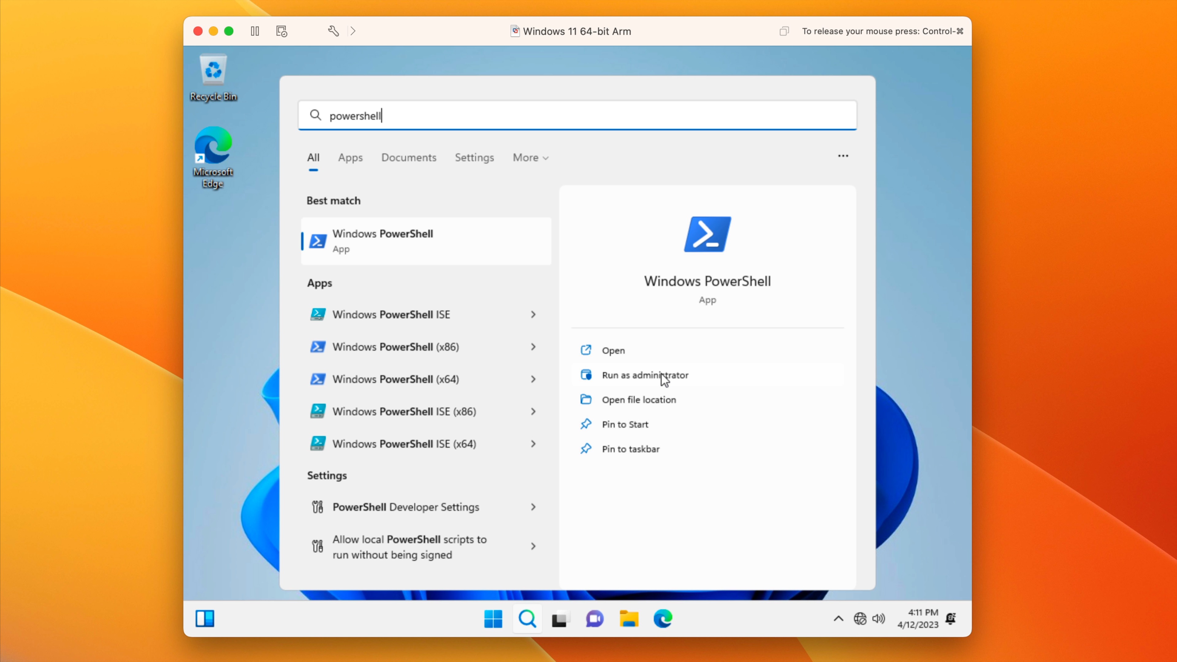 Step 7: Open the Start Menu, type “PowerShell” in the search box, and click Run as administrator for PowerShell. Click Yes on the User Account Control pop up, and PowerShell will open.