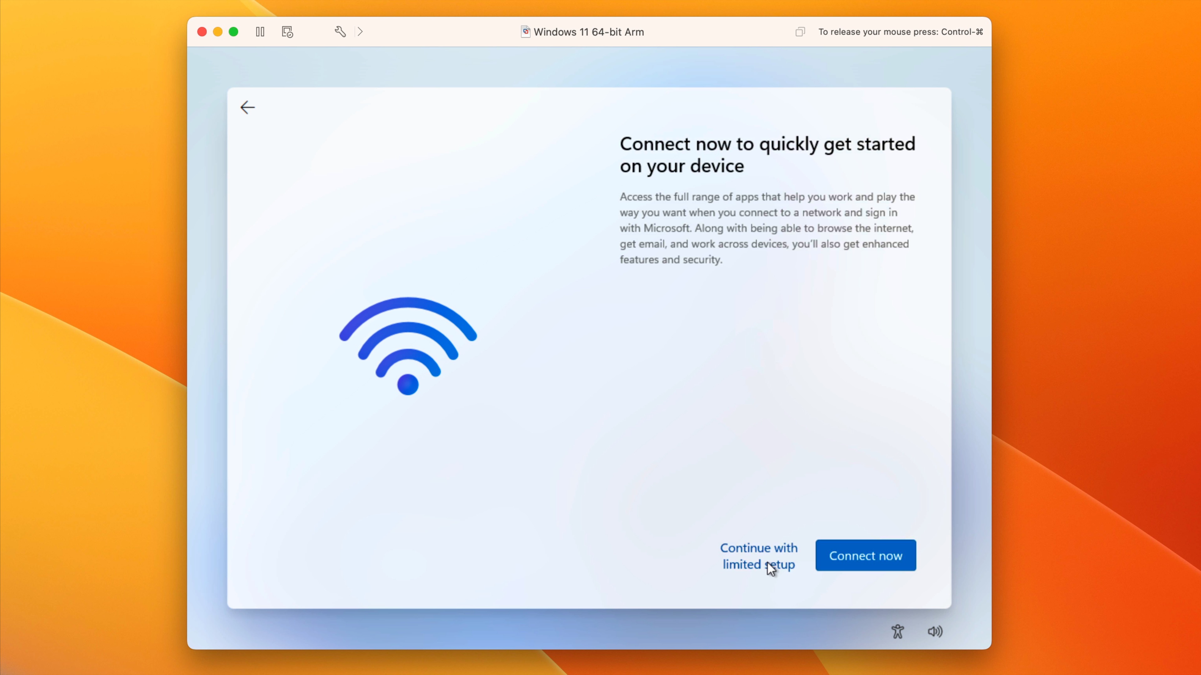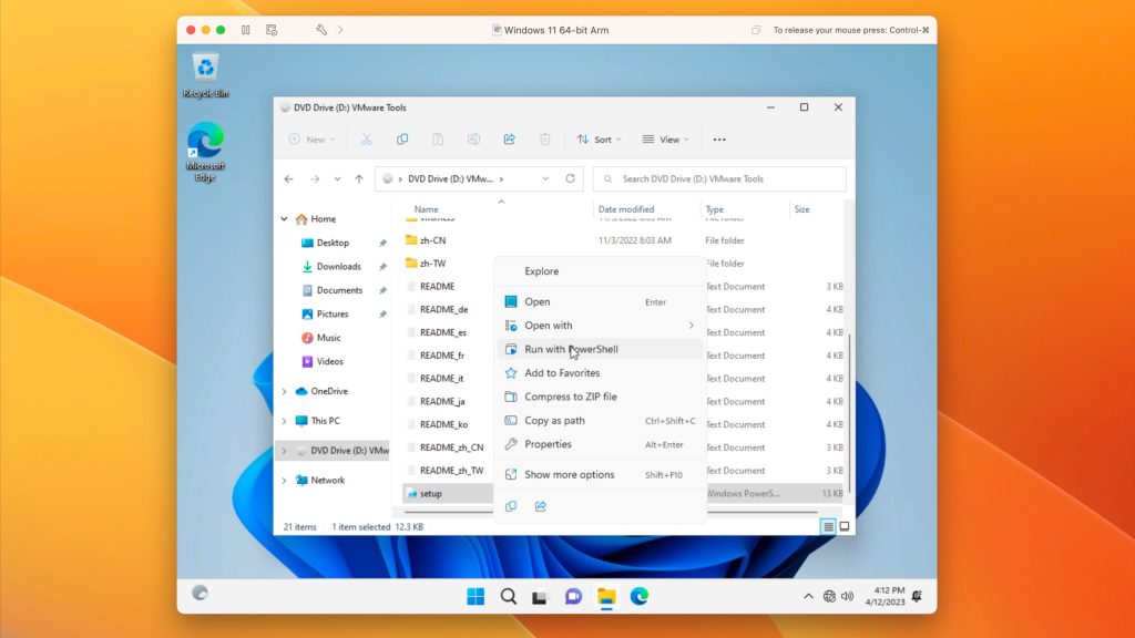 Windows for ARM doesn’t include the needed VMXNet3 virtual network driver, so you’ll need to bypass network enrollment to get through the Windows setup successfully. Once Windows is at the Home Screen, we’ll use PowerShell to make it possible to install VMware tools, which will then install the needed network and display drivers.