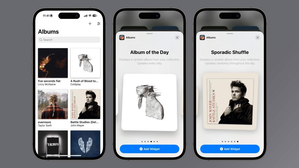 In the app, you can pick your favorite albums from Spotify or Apple Music. This creates a “Collection” that you can then add to your iPhone or iPad Home Screen via widgets. On your Home Screen, long-press to add a widget, then look for “Albums” in the list of available options.