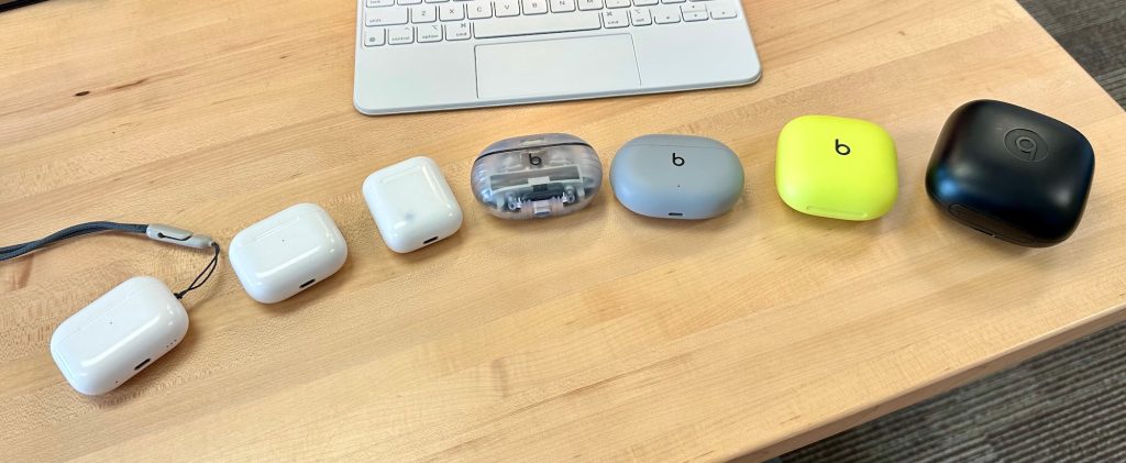 From left to right: AirPods Pro 2, AirPods 3, AirPods 2, Beats Studio Buds+, Beats Studio Buds, Beats Fit Pro, Powerbeats Pro