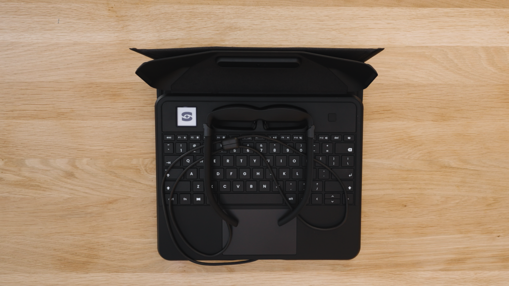 Spacetop is a little laptop-like apparatus – except instead of a fold-out screen, a set of AR glasses rests on top of the keyboard/touchpad enclosed in a foldable case. The AR glasses are tethered to the “laptop” by a relatively short, pliable cable that carries both power and data from the base. There’s a camera for video conferencing, touchpad, and all the typical ports.