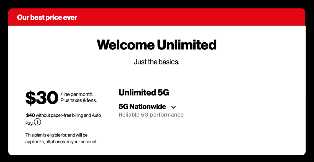 Another funny tweak in all of this, previously, Verizon called its most basic $30/month plan Welcome Unlimited. With the new myPlan offerings, it’s reversed the name to Unlimited Welcome for the same $30/month – the latter just has the option to include the $10/month add-ons.