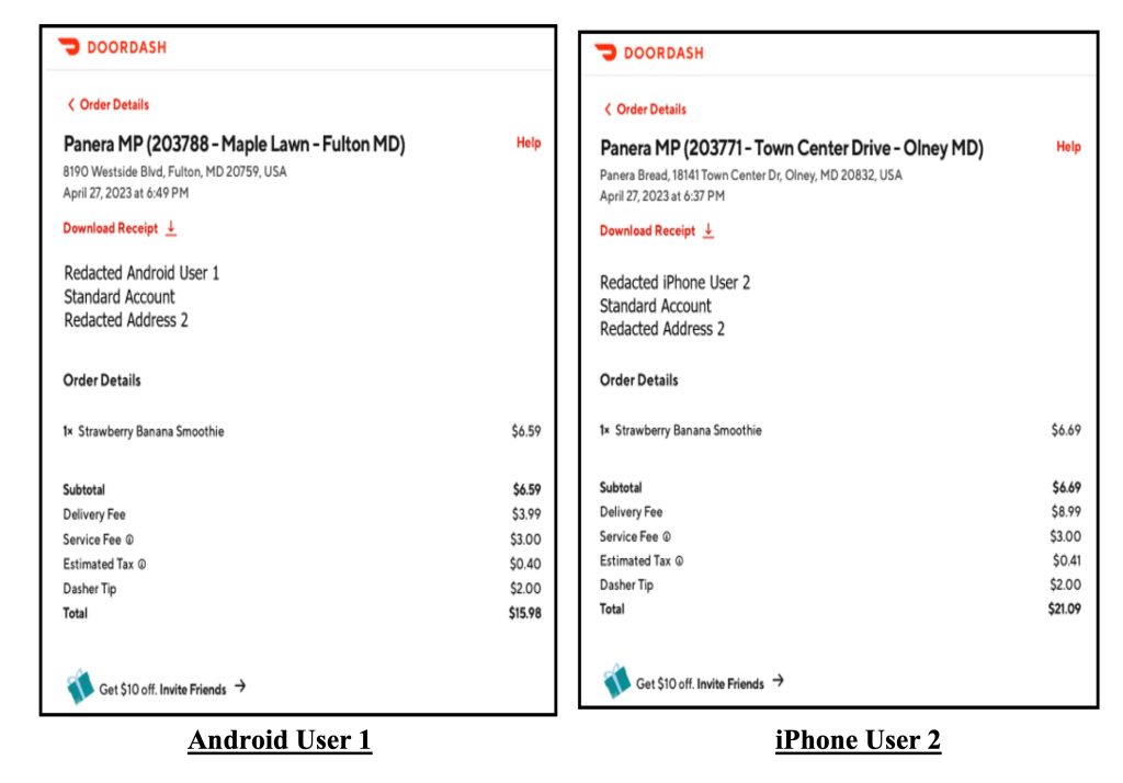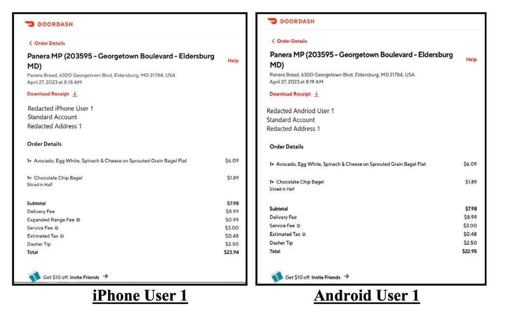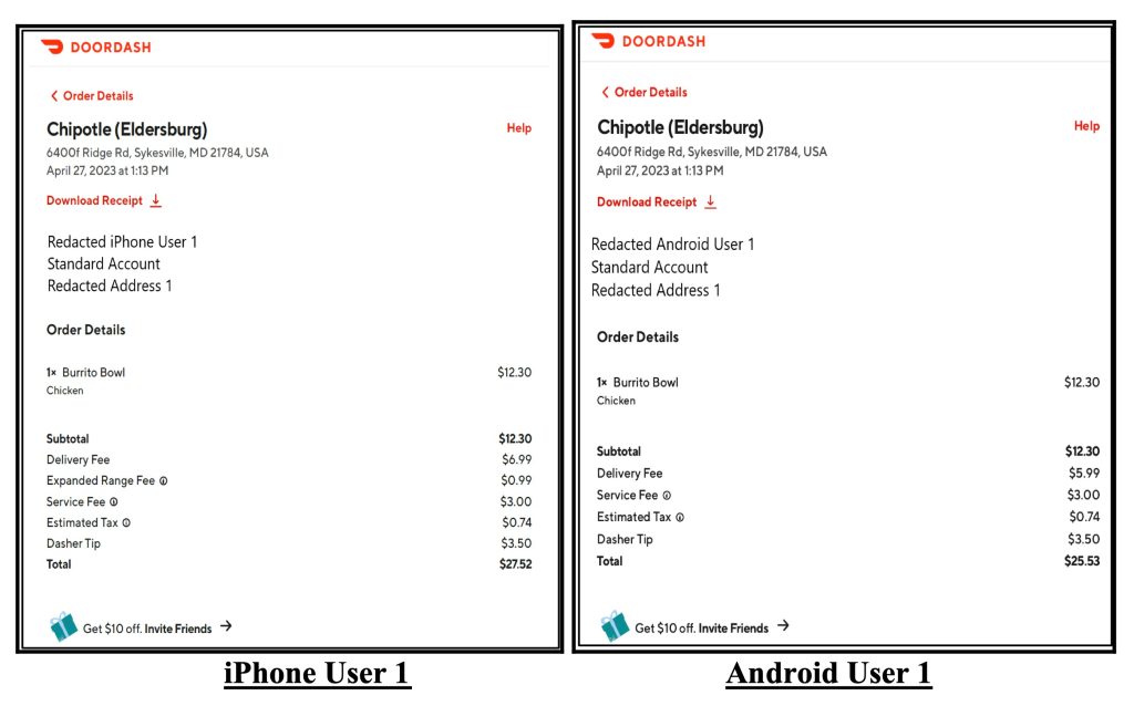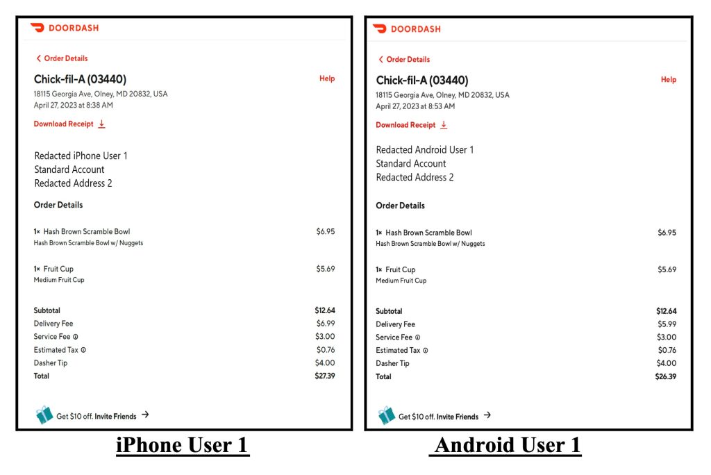 The lawsuit includes multiple screenshots that claim to show iPhone users and DashPass subscribers paying higher fees than Android users and non-subscribers.