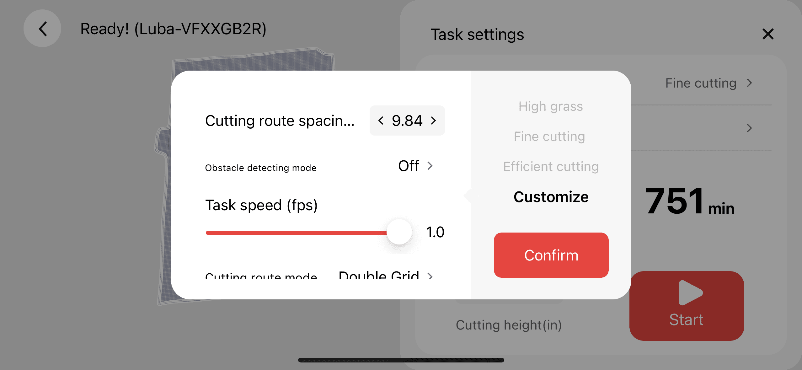 The customization options include cutting width, obstacle detection mode (off, 1, or 2), task speed, grid pattern, and more.