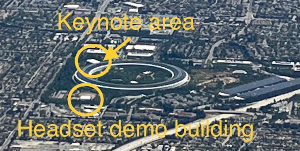 The headset demo area at Apple Park is located “at the basketball courts near its employee fitness center.” On Twitter, Gurman shared an overhead shot of Apple Park, in which you can see the demo structure itself: