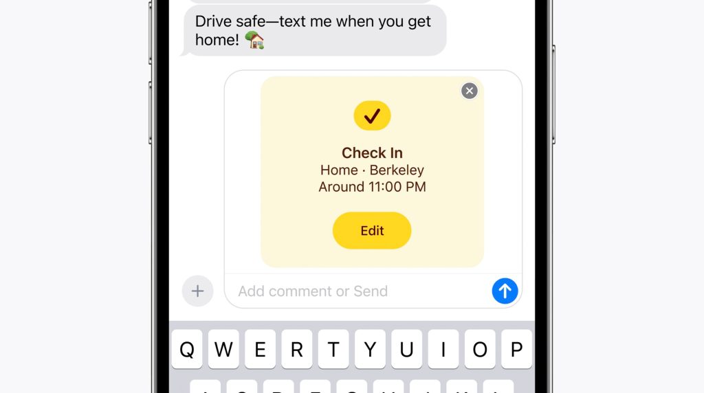 Messages introduces Check In, a feature that allows the user to notify family members and friends that they’ve arrived at their destination safely.