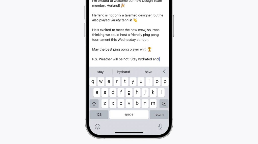 Autocorrect receives a comprehensive update with a transformer language model, a state-of-the-art on-device machine learning language model for word prediction — improving the experience and accuracy for users every time they type. It also receives a refreshed design to better support typing, and sentence-level autocorrections can fix more types of grammatical mistakes. Users will now receive predictive text recommendations inline as they type, so adding entire words or completing sentences is as easy as tapping the space bar, making text entry faster than ever. Dictation leverages a new speech recognition model to make it even more accurate.