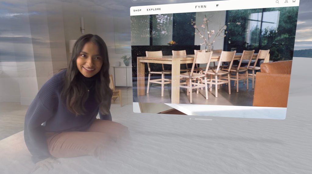 FaceTime becomes spatial: With Apple Vision Pro, FaceTime calls take advantage of the room around the user, with everyone on the call reflected in life-size tiles, as well as Spatial Audio, so it sounds as if participants are speaking right from where they are positioned. Users wearing Vision Pro during a FaceTime call are reflected as a Persona — a digital representation of themselves created using Apple’s most advanced machine learning techniques — which reflects face and hand movements in real time. Users can do things together like watch a movie, browse photos, or collaborate on a presentation.