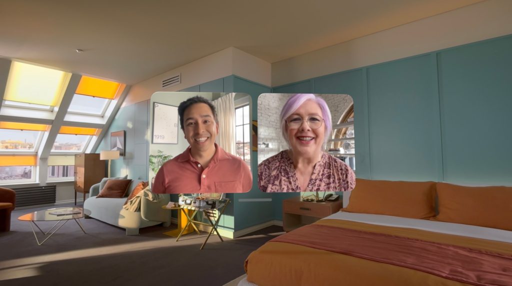 FaceTime works with group calls and expands spatially. SharePlay lets you share apps that you view in large windows next to video tiles.
