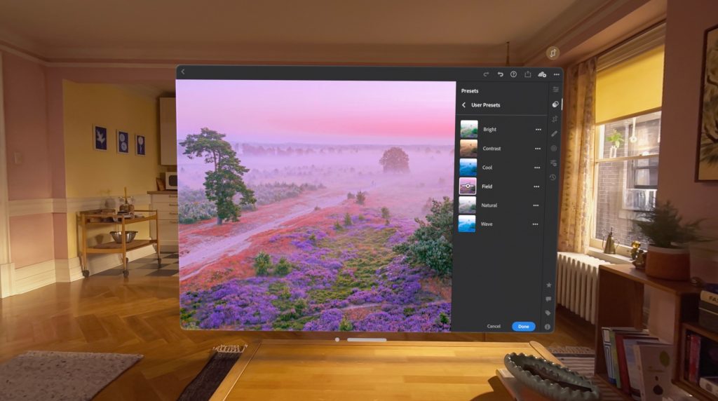 Along the side of the visionOS interface is a menu that expands to show “People, Apps, and Environments.” I chose the Environments option and saw one called “Mount Hood,” which was fully immersive and surrounded me on either side and behind me. This is also one of the times I used the Digital Crown to control my level of immersion. At any point, I could raise my hand it would appear on top of the mixed reality interface.