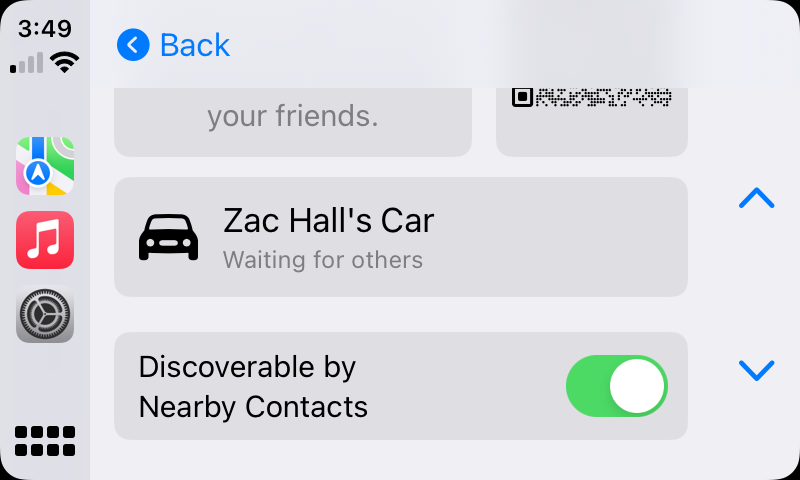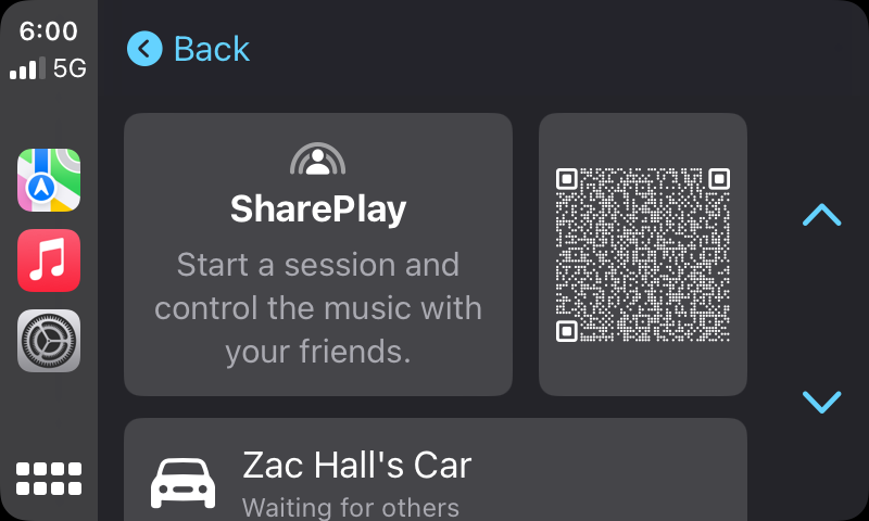 Starting up Apple Music SharePlay in the car happens from the Now Playing screen. Tapping a SharePlay icon looks for nearby contacts who are running iOS 17 or later. There’s also a QR code that any passenger can scan to easily join the SharePlay session.