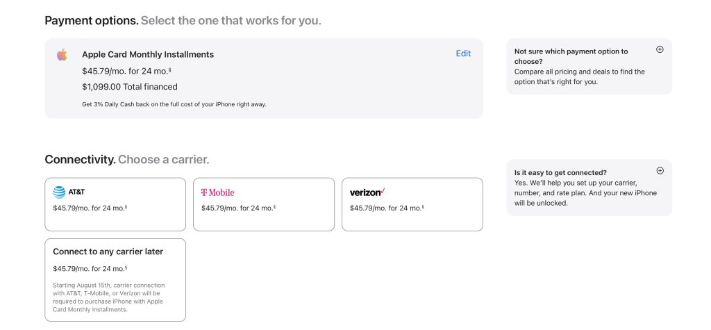 The “Connect to a carrier later” option will no longer be available for purchases financed with Apple Card Monthly Installments. This was already the case with iPhones purchased from Apple Stores, but it now applies to online purchases as well. Note that the iPhones will still be unlocked, but the carrier connection will be required at the time of setup.