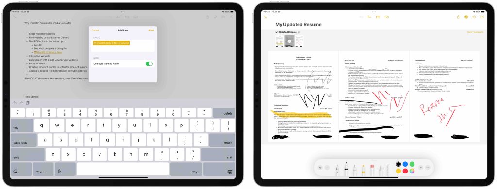 Apple Notes receives significant enhancements in iPadOS 17, adding even more features to its already robust feature set. The biggest update here is the ability to use the Notes app as a PDF editor. You can now import a PDF and edit it as if it is a PDF editor. You can highlight, edit, cross off, note down, and even use autofill features to fill out any documents you need. This also works with the collaboration feature, so you can share the doc and work on it in real-time with someone else.