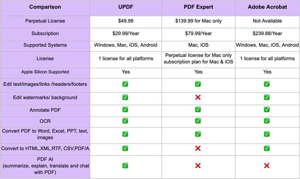 One thing great about UPDF is how it has a competitive advantage over competitors like Adobe Acrobat and PDF Expert. That’s because UPDF includes the most useful features, some of which are only available from one competitor or the other, all in a single app. Superace Software does all this while still dramatically undercutting the competition on annual and lifetime prices.