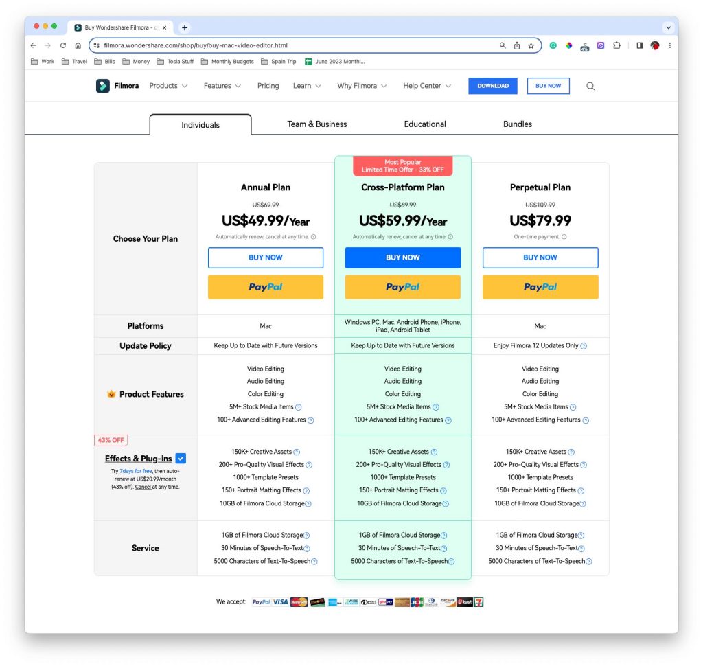 In terms of pricing. Filmora offers an Annual Plan – on sale for $49.99 per year – that allows you to use it on one device. There’s also a cross-platform plan for $59.99 per year, allowing you to use it on any device, and then there’s a perptual license for Mac that goes for $79.99.