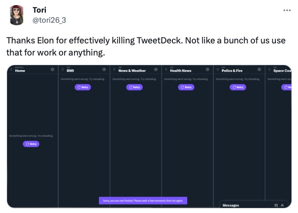 Given that TweetDeck loads up multiple tweets through various columns simultaneously, it’s likely that the effects of the read restrictions are amplified within TweetDeck.
