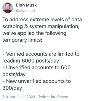 The exec summary is that Musk claimed too many bots were scraping Twitter content, and this was putting an unacceptable load on the servers. Rather than take action to block the bots specifically, Musk decided to limit everyone’s access to Twitter.