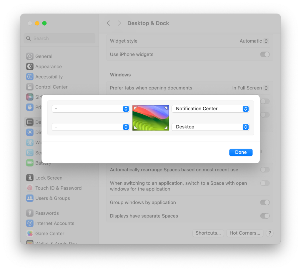Here’s how to set up Hot Corners: launch System Settings, select the Desktop & Dock section, scroll down to the bottom, select Hot Corners.
