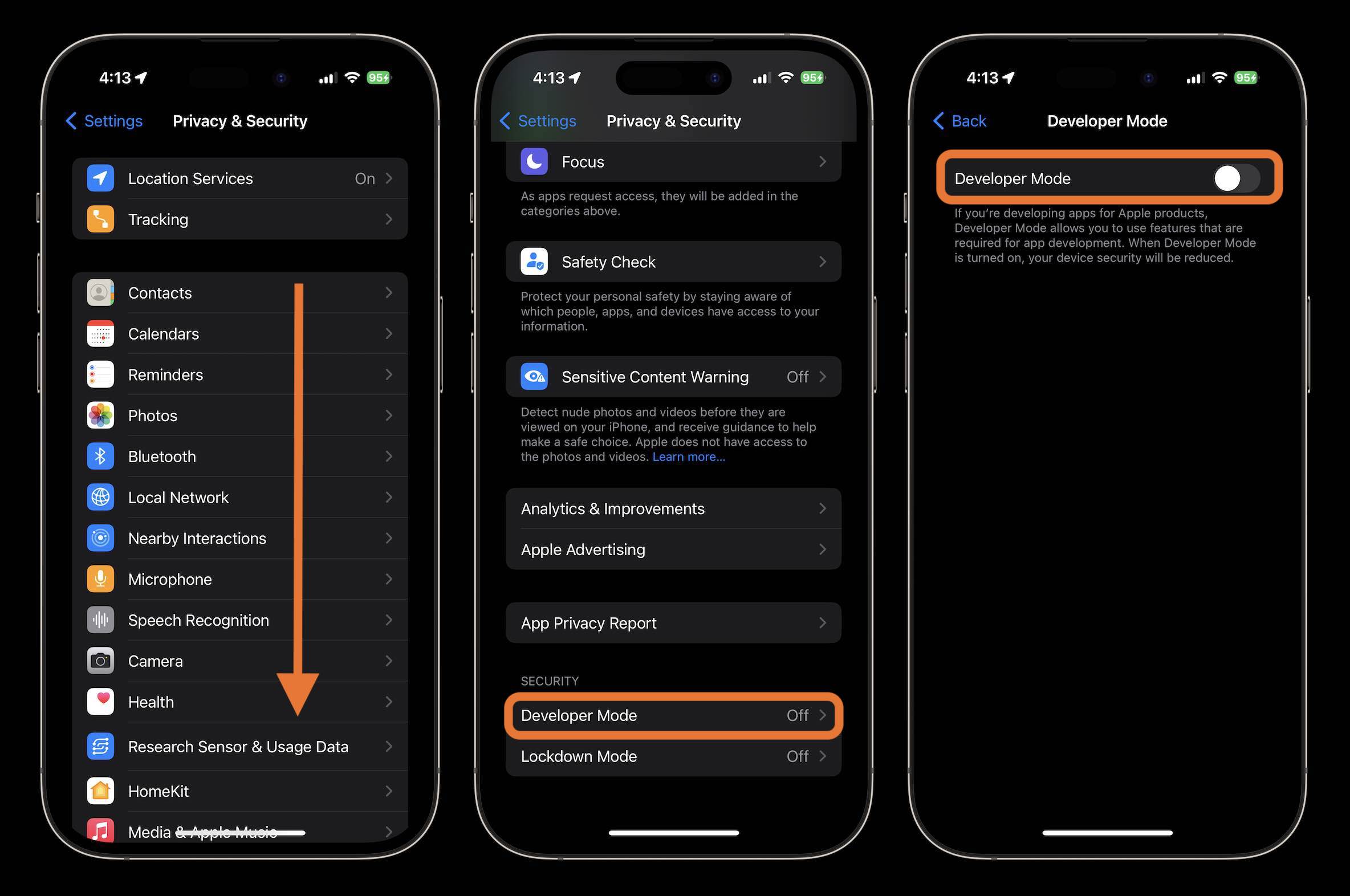 - Choose Privacy & Security > swipe to the bottom and tap Developer Mode