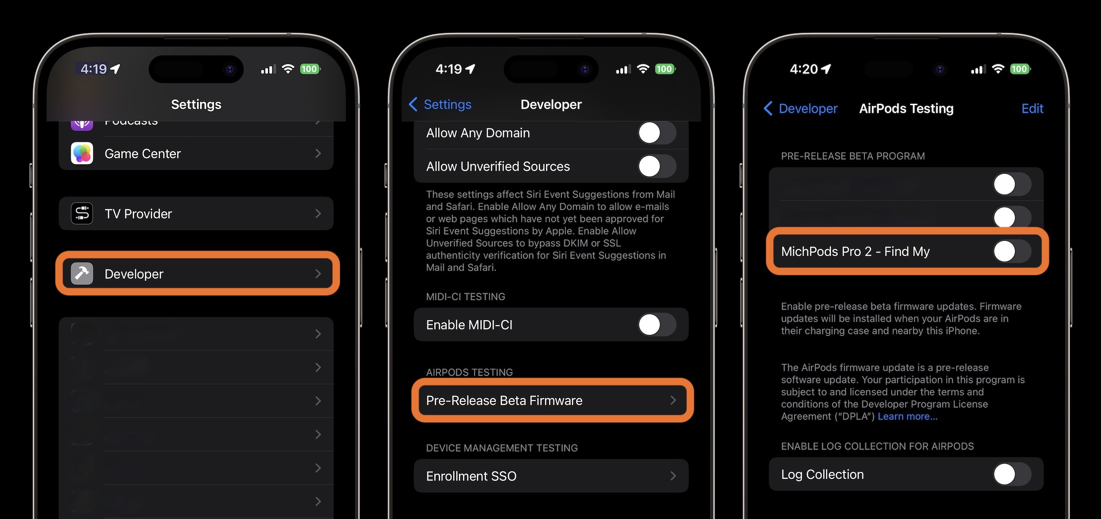 - Swipe to the bottom and under AirPods Testing tap Pre-Release Beta Firmware