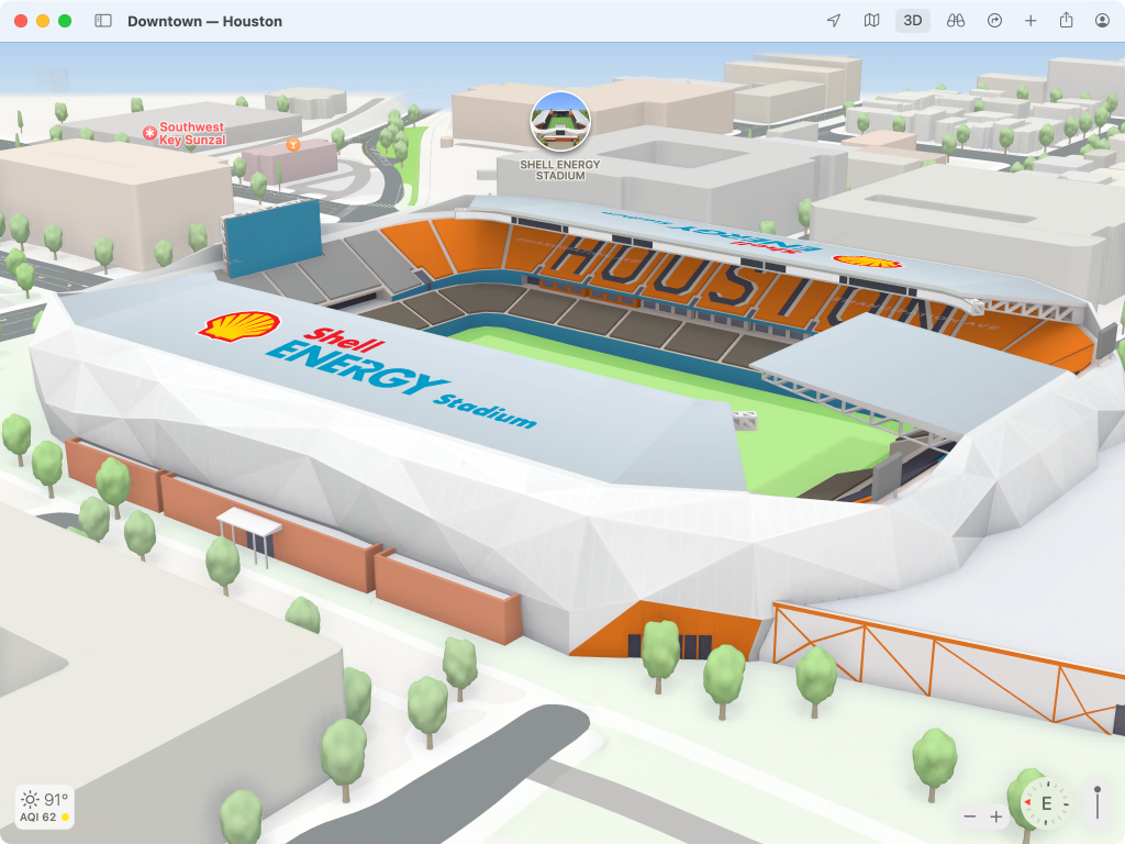 However, it appears that at least two additional cities have gone live. One confirmed location is Houston, Texas, where Apple Maps now includes a rich 3D with custom-designed views including NRG Stadium, Minute Maid Park, Toyota Center, and Shell Energy Stadium. Apple has also introduced the detailed city experience feature to Dallas, Texas.