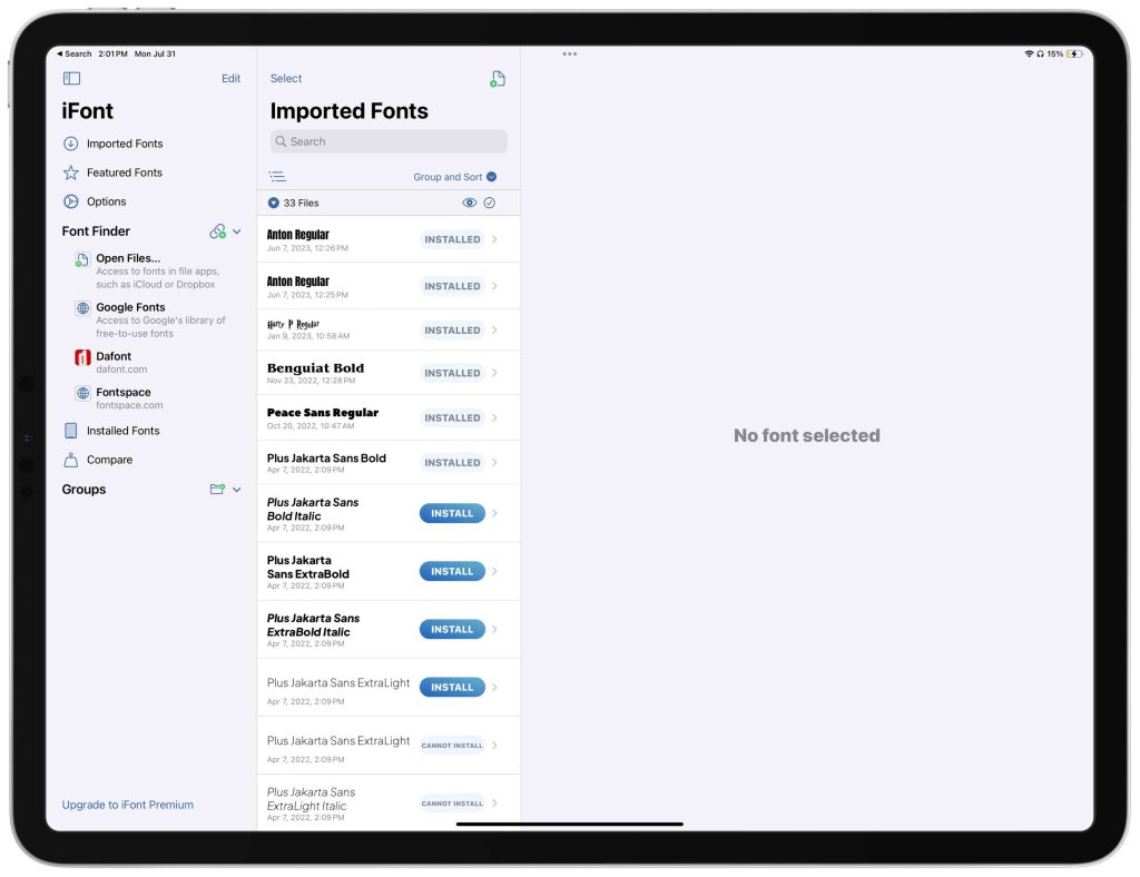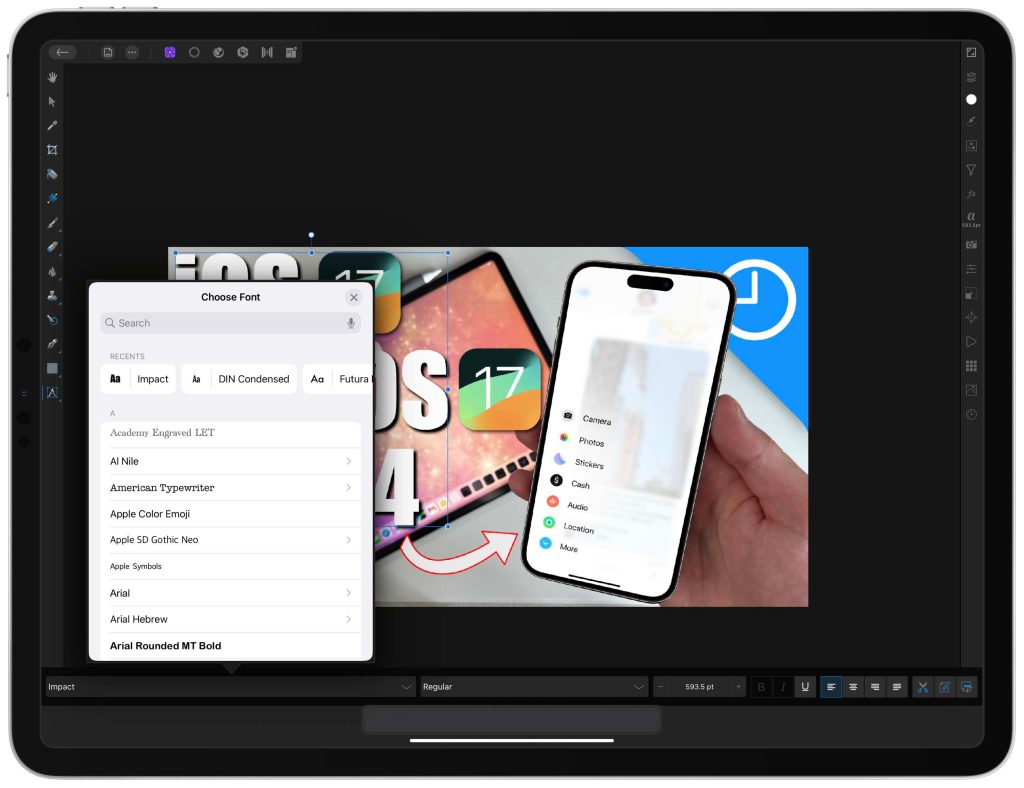 When I first updated to iPadOS 17 Beta 1 I noticed that I could not find my custom fonts when trying to add text to my thumbnail. I pretty much just drew it up to being on the Beta and then I just used an alternate one in the meantime. As each beta was updated, the issue still persisted. Now we are on iOS and iPadOS 17 Beta 4 and the issue continues to be there. I am unable to use my custom fonts in any of my apps. You can see from the image below that in my iFont management app I have a few custom fonts like Anton and Harry Potter, but when I try and find them on my Affinity Photo app, they are not appearing. This is the case with every app I have tried.