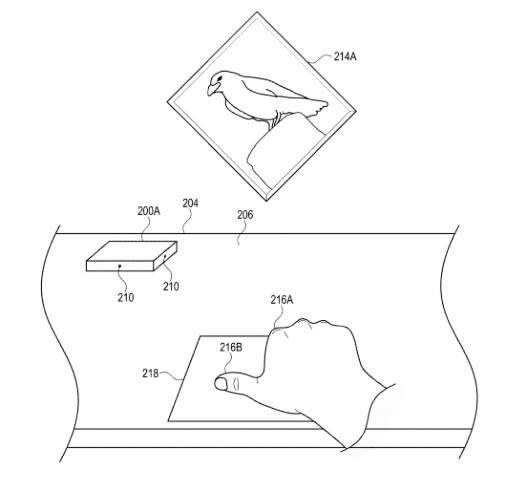 The patent illustrations show a small box on the table, and show it detecting other Magic Trackpad-style gestures, like using thumb and forefinger to rotate a photo: