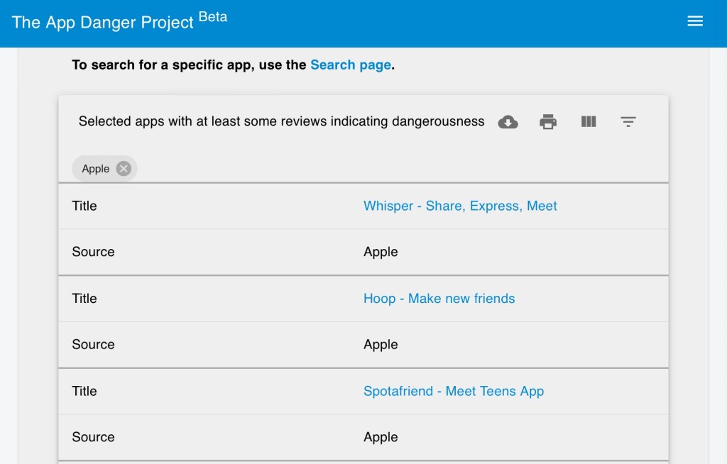 First is a list of apps “with at least some reviews indicating dangerousness” that have been flagged by the project.