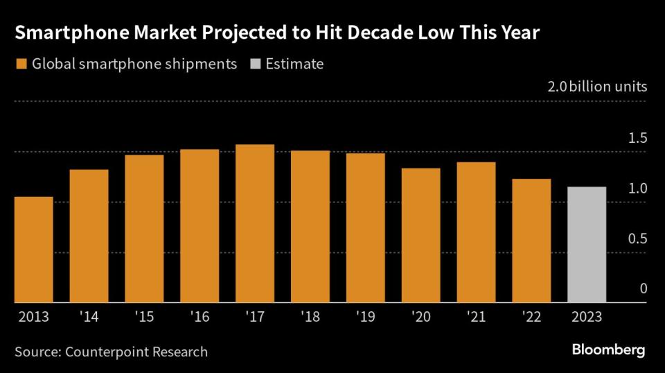 Counterpoint is predicting that the global smartphone market will again decline this year, hitting the lowest number of shipments in a decade.