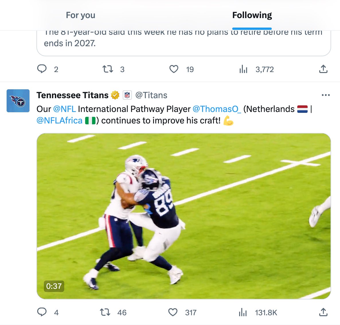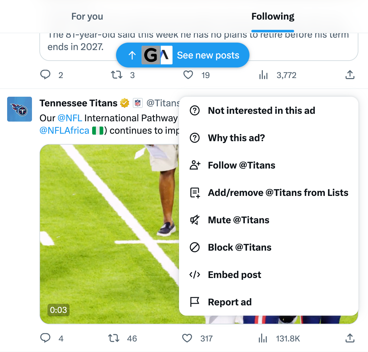 As noted by Sarah, because many ads are labeled on X (top right corner), that makes finding the unlabeled ones trickier. She ended up finding “a good handful of unlabeled ads” in her Following feed like this one from the NFL: