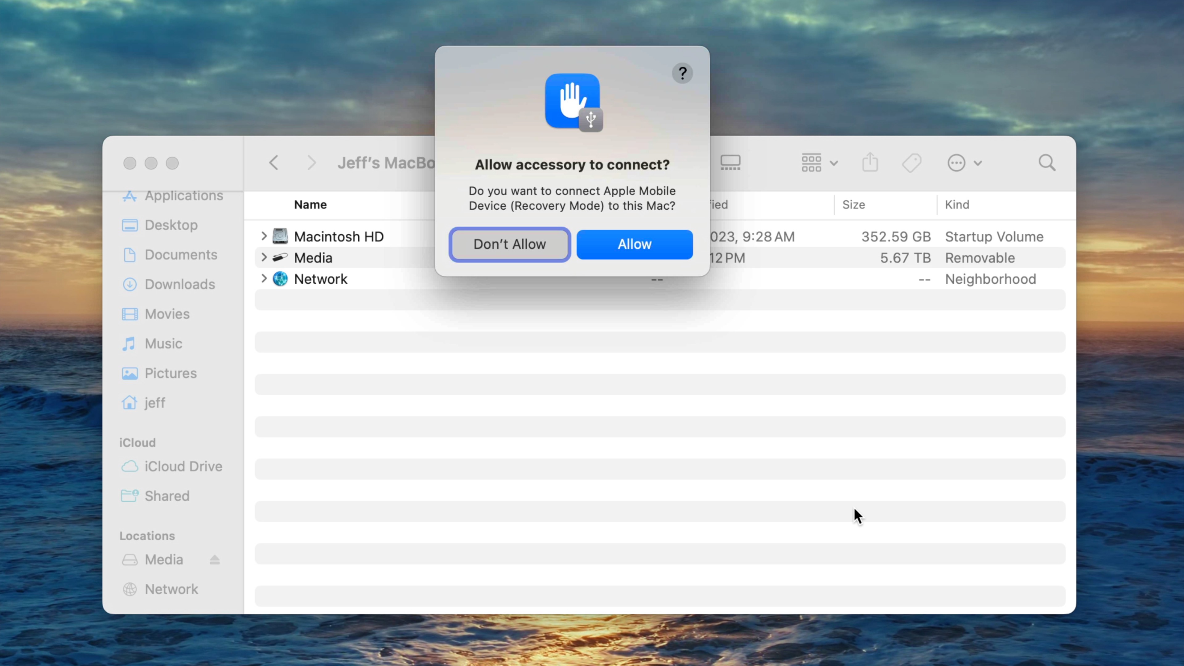 If this is the first time connecting your iPhone 15 to your Mac, you’ll need to tap the Trust button that appears and enter your iPhone’s passcode in order to establish the pairing. If you’re running a more recent version of macOS, you’ll also need to allow the device’s USB connection to your Mac by clicking the “Allow” prompt that appears on macOS. Next, you’ll need to open Finder, and click your iPhone under the Location heading in the Sidebar. Click the Trust button that appears in the Finder to complete the connection.