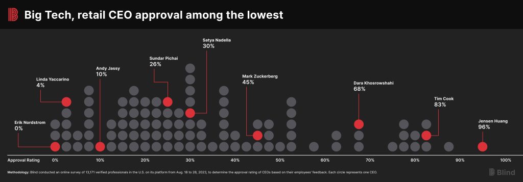 The data comes from Blind, which touts nine million verified anonymous professionals who make up its social network. The results are based on 13,171 verified professionals in the US who responded to a survey in August that asked to provide an approval rating for 103 CEOs based on employee feedback.