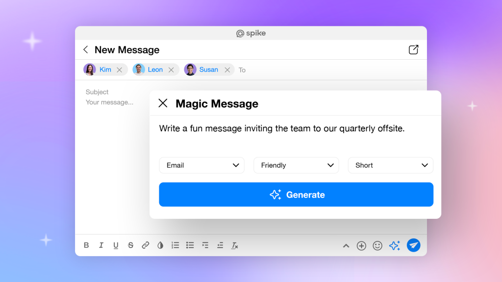 Magic AI Bot: Spike’s AI bot can be accessed over email inside the Spike app. All you need to do is send a message to ai@spike.chat in order to access it. You can use it with similar prompts that you’d ask ChatGPT but without leaving your inbox.