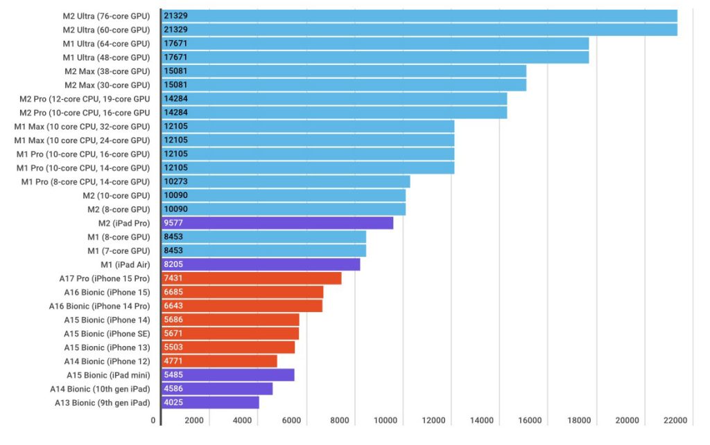 All current Apple processors are compared in an updated chart, mixing in iPhone, iPad, and Mac chips to show their relative power in benchmark tests – including, of course, the new A17 Pro.