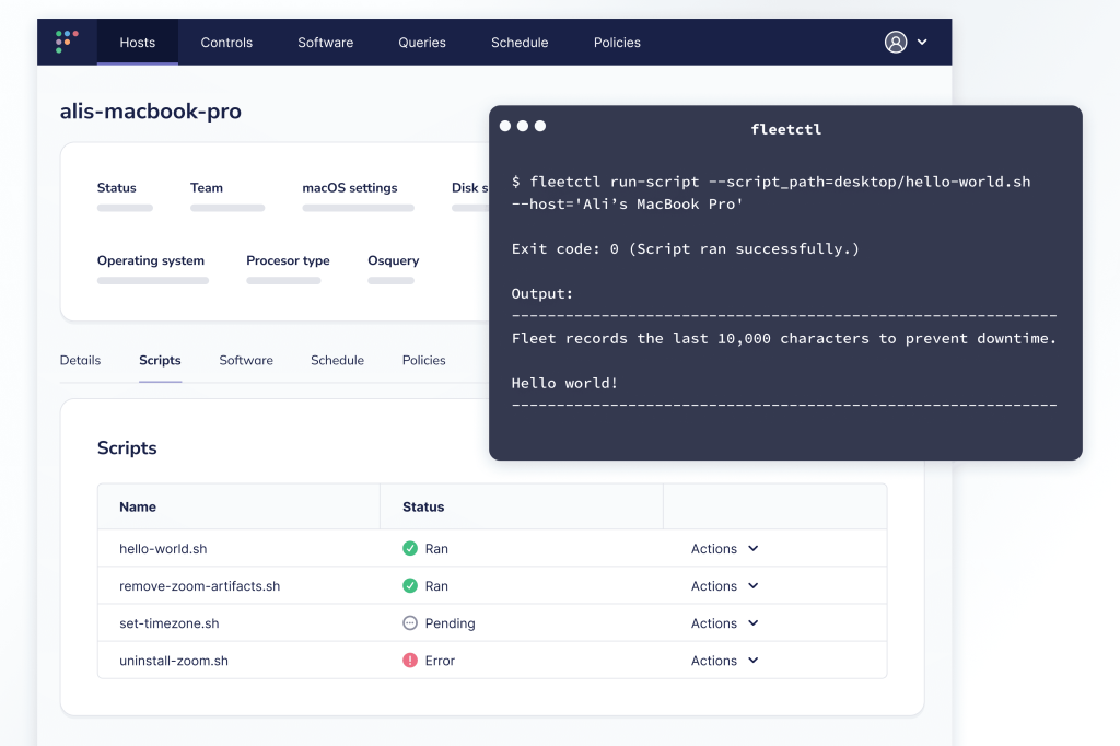 Fleet allows teams to execute shell scripts via its command line or REST API. They do this by writing a SQL query to discover which hosts have issues, running a script, and then checking the UI or running the query again to confirm, like an automated unit test. Traditionally spread out across multiple systems, Fleet lets people do all of this in one system making it easier to show progress towards security goals.