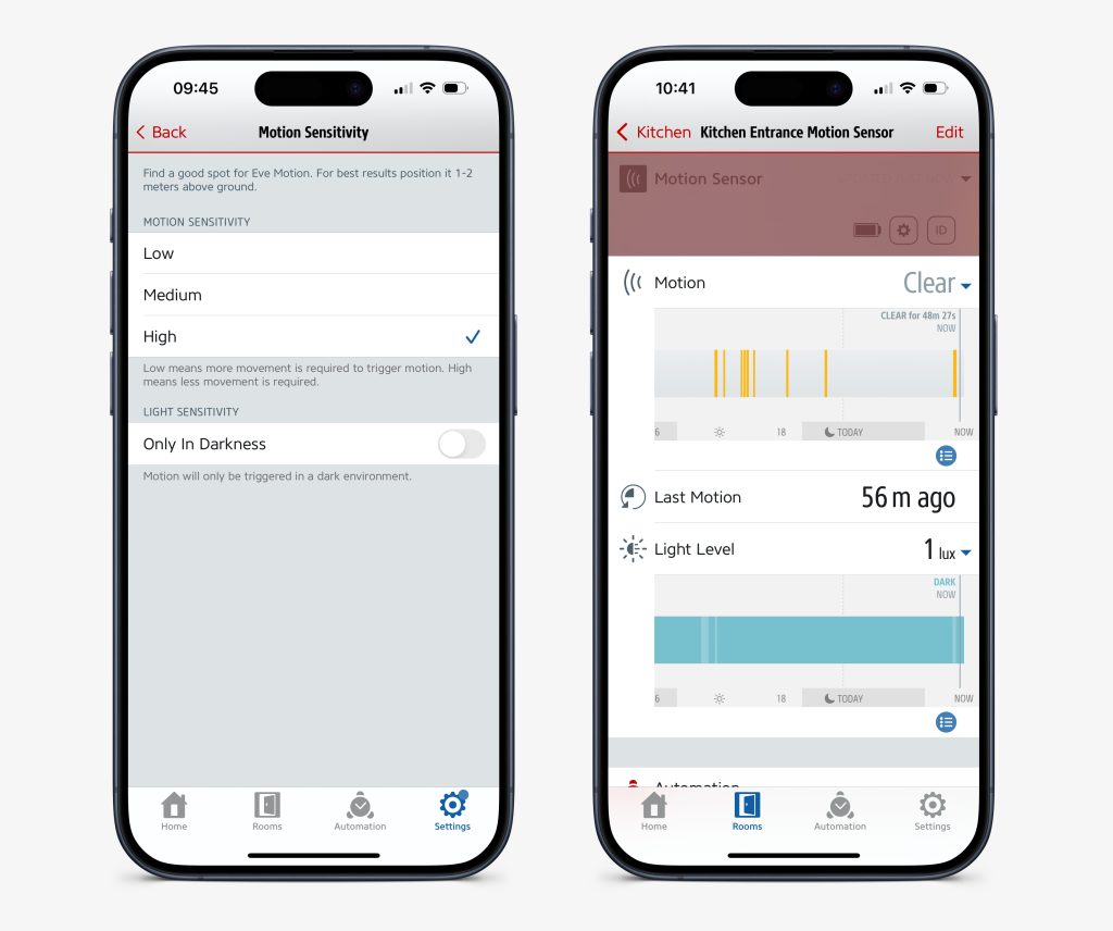 As a good HomeKit citizen, you can set up and use the Eve Motion inside of the Apple Home app, ignoring Eve’s own app altogether. But if you do have the Eve app installed, you can configure some additional settings (motion sensitivity / duration) and see a historical chart showing tracked sensor events over time.