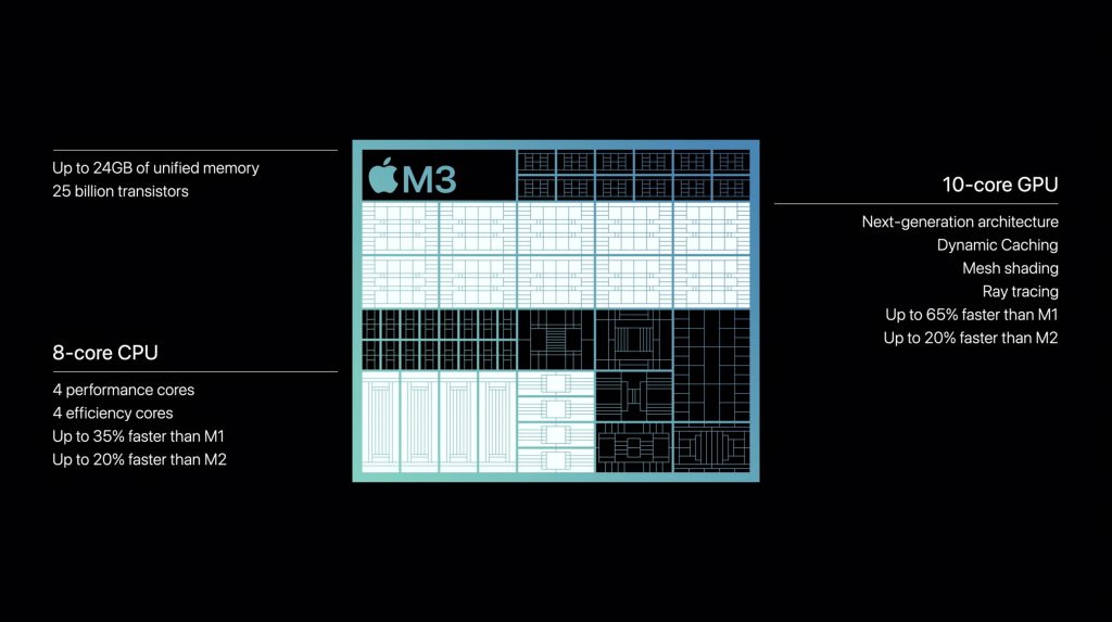 Apple is also bringing 3 nanometer chip architecture to the Mac for the first time with M3 — like the A17 Pro in iPhone 15 Pro.
