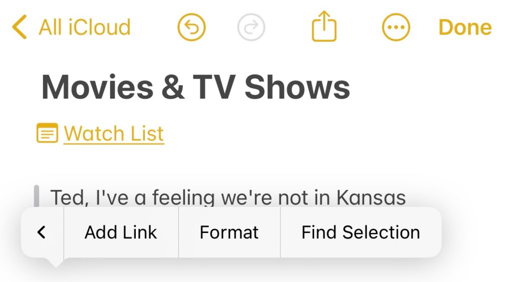 Once your link is added, switching between notes is lightning fast. For example, I’ve linked my note of movies to watch with my note of movies watched. Tapping each link takes you back and forth without delay.